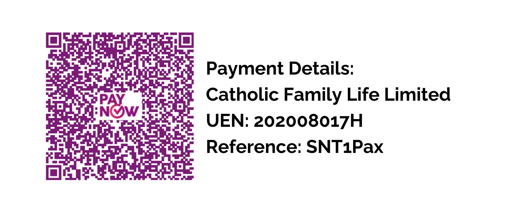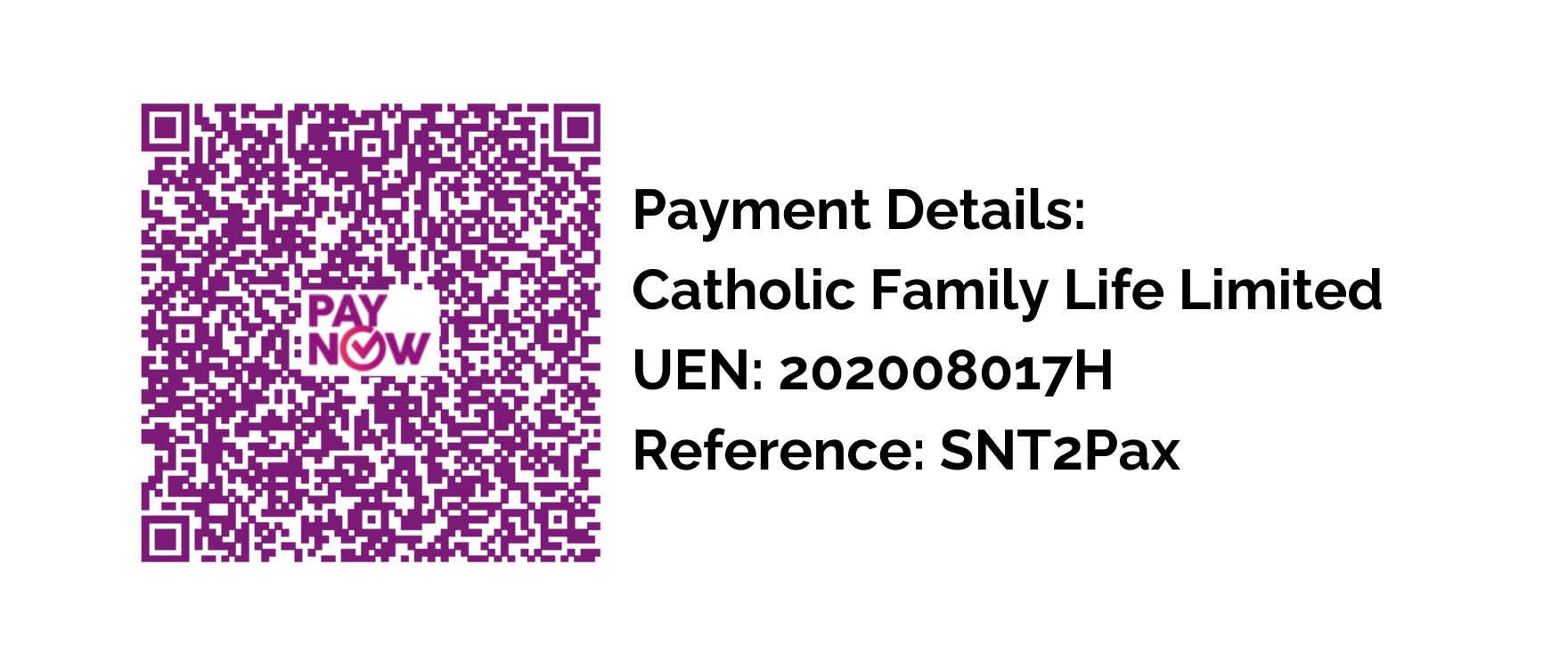 Type SNT1Pax or SNT2Pax in the unique reference code. - Attach screenshot of completed transfer with unique reference code with the registrant's full name and email to events@familylife.sg
