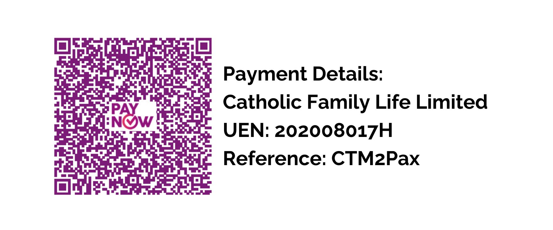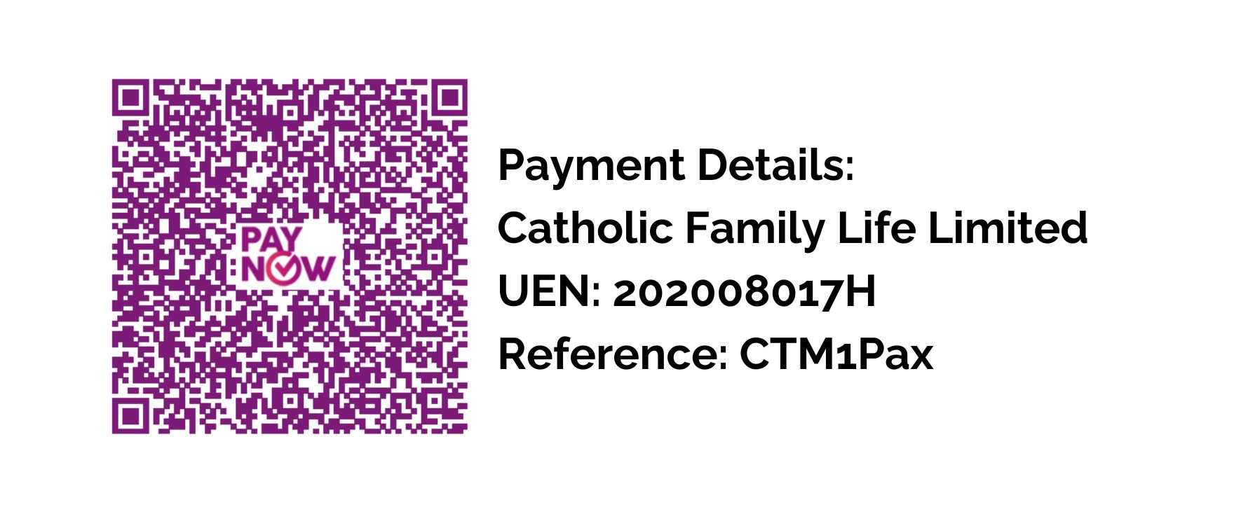 Type CTM1Pax or CTM2Pax in the unique reference code. - Attach screenshot of completed transfer with unique reference code with the registrant's full name and email to events@familylife.sg