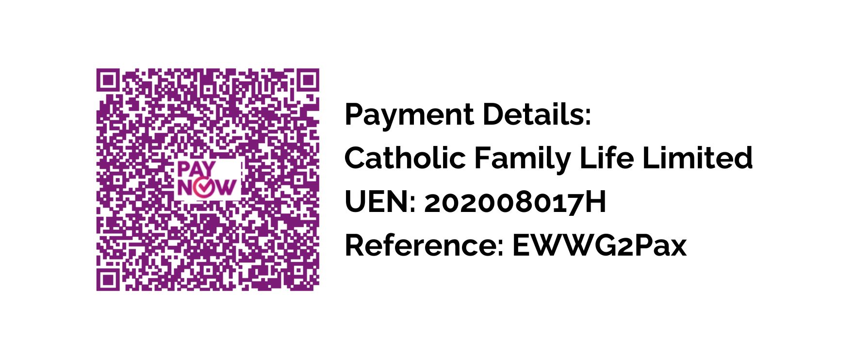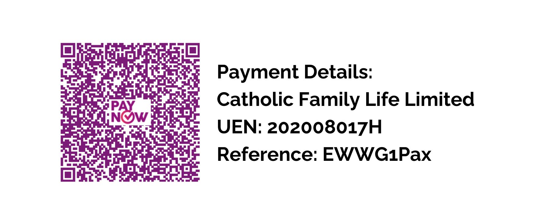 Type EWWG1Pax for 1 pax or EWWG2Pax for 2 pax in the unique reference code. - Attach screenshot of completed transfer with unique reference code with the registrant's full name and email to events@familylife.sg