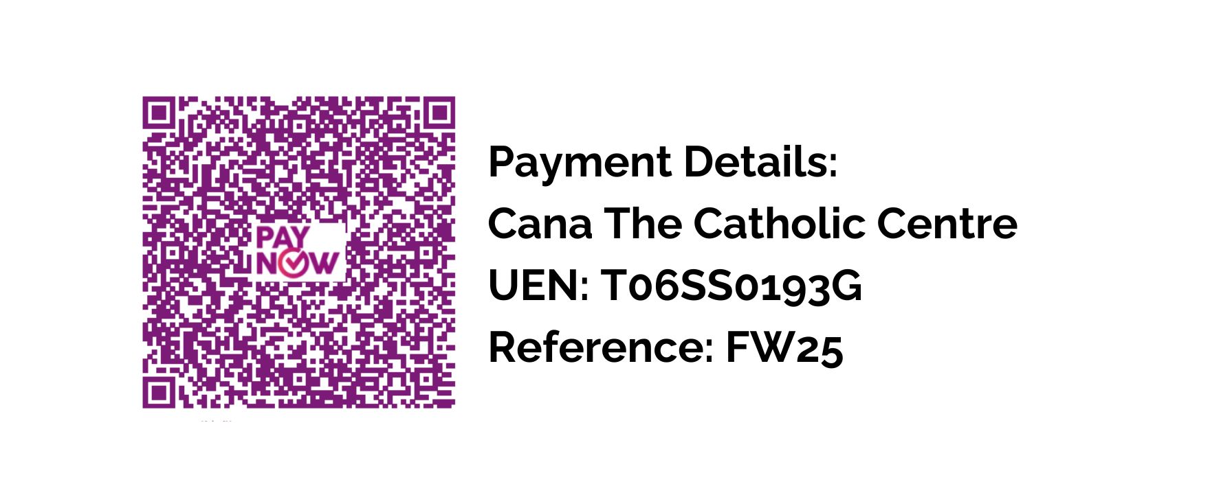 Type FW25 in the unique reference code. - Attach screenshot of completed transfer with unique reference code with the registrant's full name and email to cana@catholic.org.sg