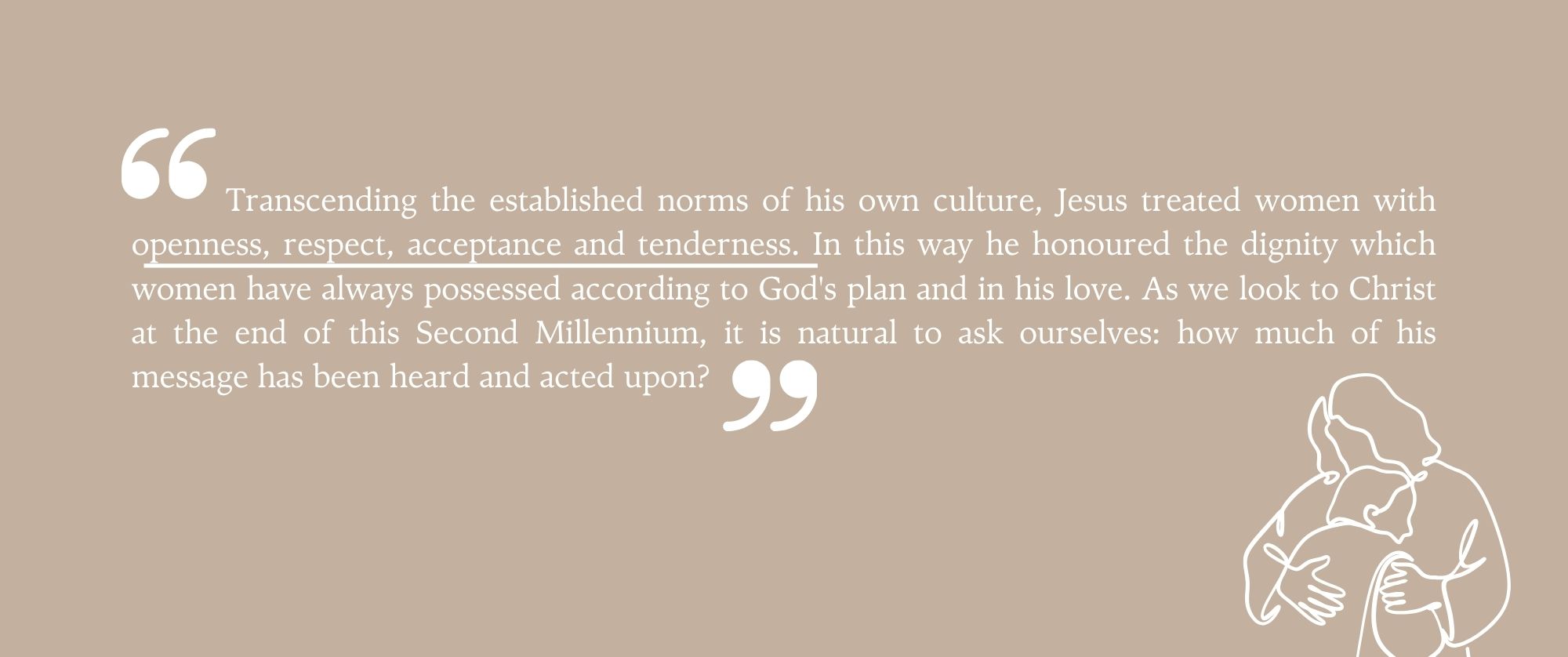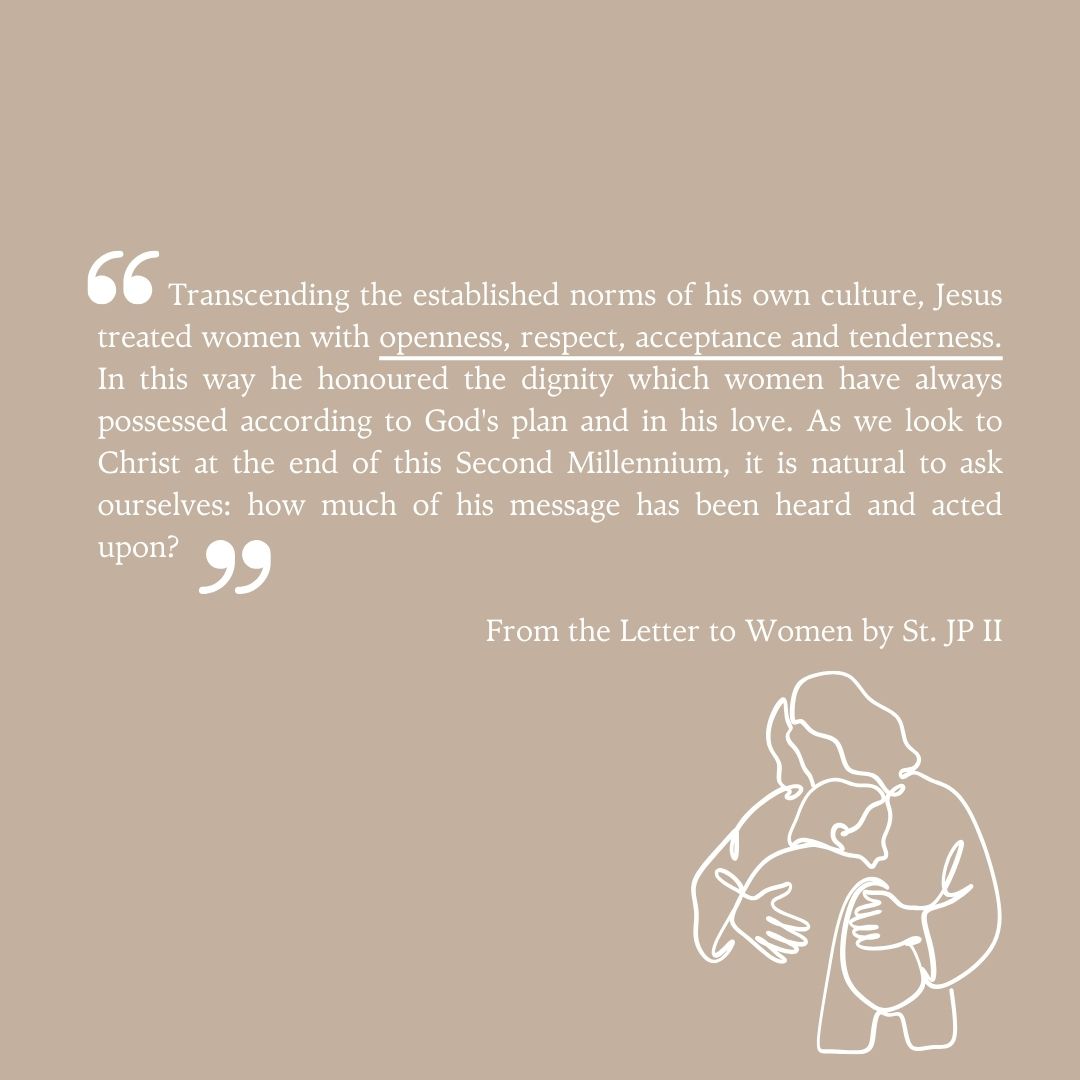 Jesus himself, shows us how to honor the dignity which women possess according to God's plan and in his love. The Lord has come to restore and rewrite our identity as women, no matter what baggage we carry in our hearts. As St. John Paul II says, scripture equips us to understand that the dignity of women is not merely a social construct or cultural preference but is rooted in the very essence of what it means to be human (Gen 1:27). It is an intrinsic aspect of human nature that must be acknowledged, respected, and upheld in all aspects of life.