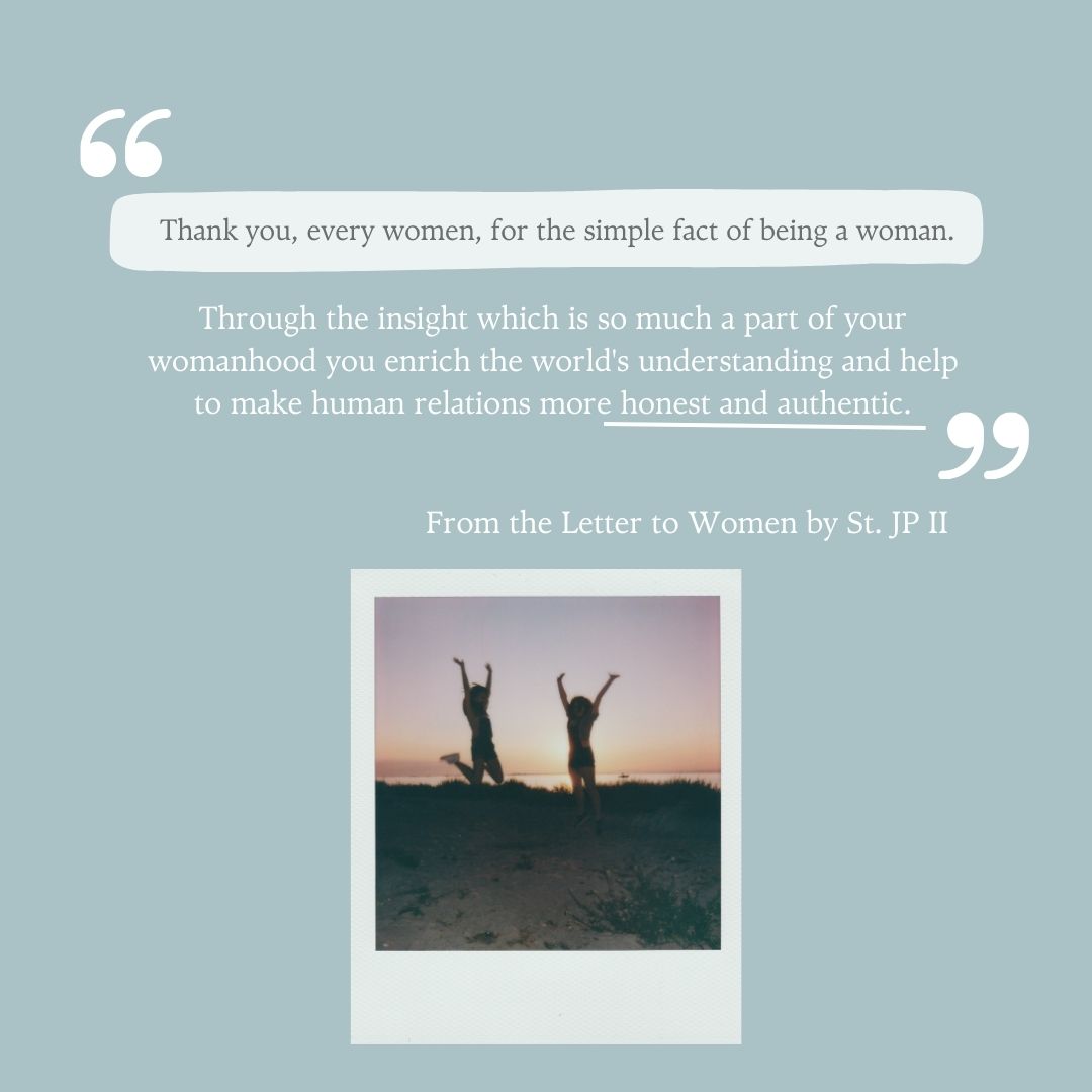 St. Teresa Benedicta of the Cross (Edith Stein) once said “The world doesn’t need what women have, it needs what women are.” In modern times, it is far easier to flow with the current. We desire to be relevant, significant and to belong. Our identity gets easily built on passing things of the world - education, background, appearance, job etc. The secular world will try to define and exploit our identity as women but we must never allow these noises to drown the spiritual gifts that God has bestowed on us. St. John Paul II, a saint of our times, wrote a letter and apostolic exhortation on women (Mulieris Dignitatem) points us to the core identity of what it means to be female as God created us to be. His spiritual fatherhood broadens our perception and aids us in eradicating our own false notions of what being a Catholic woman of our times means.